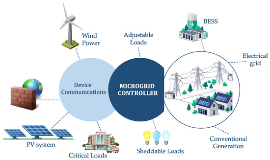 In this context, the popularity of RESs has increased over the years [1], as their integration within the utility grid is an attractive solution. However, maintaining cost-effectiveness and reliability remains a challenge. Therefore, microgrids (MGs) are the most promising solution as a next generation energy system [2]. An MG is defined as a small-scale electrical power system (EPS) made up of a cluster of loads (static, dynamic, flexible, and adjustable, etc.) [3] and RESs that work together through software and devices for the correct energy management; it is also designed to provide the efficiency of a local commu-nity’s energy supply. It is generally connected to low voltage levels associated with some RESs, such as microturbines, fuel cells (FC), and photovoltaic (PV) systems, along with energy storage systems (ESSs), including flywheels, batteries, supercapacitors (SC), and electric vehicles. The typical diagram of an MG is shown in Figure 1.