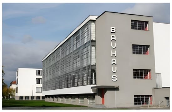 Due to the assistance of multiple art schools, actions, and organizations such as constructivism, De Stijl, Bauhaus, and the CIAM, modern architecture has grown stronger and more widely accepted in the twentieth century. The avant-garde has taken it upon itself to adopt and spread modern architectural ideas and create new architectural visual appeal that glorifies technologies and materials. An amazing example of how a modern product should look is the Bauhaus building in Dessau [3,16]. See Figure 2. It is usually accurate to say that, “The Modern Movement was formed, aesthetically and pedagogically, whenever the Bauhaus passed to its new structure and syllabus in Dessau in 1926” because the Bauhaus had a huge impact on the physical structure of the Modern Movement [2,17].