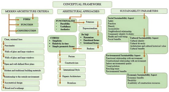 In the last stage, observations were evaluated in the findings section of the study in order to determine the relationship between modern architectural criteria and approaches and sustainability. The conceptual framework of the study is presented in Figure 3.