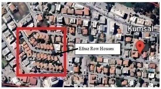 The Kumsal region, which is located between Mehmet Akif Caddesi (Dereboyu) and Bedrettin Demirel Avenues, which is examined in this study, is a region where commercial, entertainment, and residential areas are dense. See Figure 6. In the findings section of the study, the modern-period effects of the buildings selected from the Kumsal region in Nicosia, Northern Cyprus will be emphasized. Efruz Houses (Müdüroğlu Houses), designed by Ahmed Vural Behaeddin, one of the leading architects of the period, was chosen as the field study. The contractor of Efruz row houses, designed by the architect Ahmed Vural Behaeddin, was Efruz S. Müdüroğlu. That is why these row houses are called Efruz Houses. See Figure 7 and Figure 8.