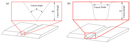 In an effort to simplify the complex canyons section, it is essential to take the consistent nature of their outlines into account. Given the limited impact on the overall outline of the canyon, the relative height of protruding rocks or vegetation within the valley is deemed inconsequential [32]. Consequently, factors that do not significantly influence the characteristics of the canyons within this specific section are excluded. In this study, two types of canyon sections, V-shaped canyons and U-shaped canyons, were studied, as shown in Figure 1. The calculation model was obtained by establishing a simplified stretched cross-section. The parameters of the canyon encompassed the height β, angle α for V-shaped canyons, and width γ for U-shaped canyons.