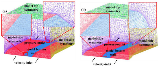 The software Integrated Computer Engineering and Manufacturing code for Computational Fluid Dynamics (ICEM-CFD 19.0) was used for computational domain grid meshing, as presented in Figure 2. The computational domain measured 15,000 m in height, 16,000 m in length, and 15,000 m in width. The V-shaped canyon shown used straight lines as the canyon walls, and the canyon parameters were transformed by adjusting the inclination angle and height. The U-shaped canyon was closer to the real canyon shape by using hyperbolic tangent curves for simulation, and the height and width of the canyon were controlled by controlling the function definition domain and value domain. The model grid utilized a tetrahedral grid, which exhibited excellent adaptability and enabled the generation of high-quality grids for a wide range of complex structures. In order to better simulate the characteristics of the wind field in the canyon, the grid near the canyon surface was encrypted. It used a prism mesh to divide the wall of the mesh. The height of the first layer of the grid was 5 m, and the grid growth rate was 1.2. The total number of meshed cells exceeded 5 million, as shown in Figure 2.