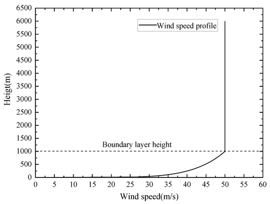 The velocity inlet boundary adopted a wind speed profile with the surface friction coefficient of the B-type surface [5,29], as shown in Figure 3. The height of gradient wind speed was 1000 m, and the gradient wind speed was assumed to be 50 m/s. The wind speed varied in an exponential law when the height was lower than 1000 m. Above 1000 m, the wind speed remained unchanged. The wind speed profile can be expressed as follows: