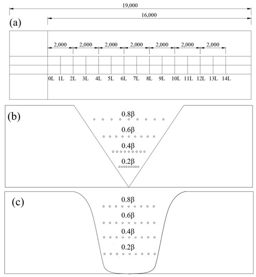 To investigate the wind field distribution in the canyon, a series of wind speed monitoring points were set up in the simulative terrain. In this paper, the wind speed monitoring points were arranged in the height and horizontal direction of different sections. As shown in Figure 4, the monitoring section was arranged every 1000 m from 0 L to 14 L along the canyon section direction. In each section, twenty monitoring points which grew exponentially were arranged along the height direction at the center of the canyon, and the highest was at 5000 m. The layout of monitoring points in the canyon were set at the height of 0.2β, 0.4β, 0.6β, 0.8β, respectively, and nine monitoring points were arranged in each height layer.