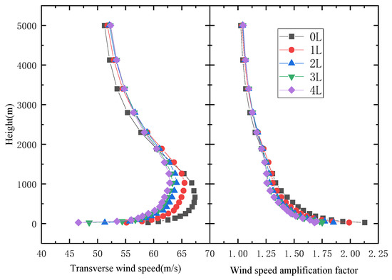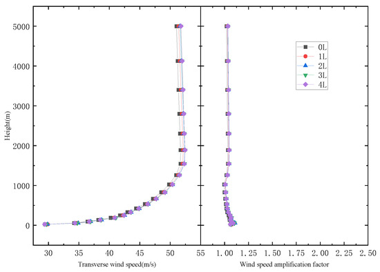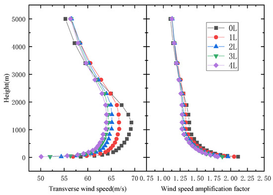 The wind profiles and wind speed amplification factor at different locations of the U-shaped canyon section center are shown in Figure 11 and Figure 12. From the wind profile at a single location in the central section, as the width of the canyon increases, the wind speed gradually decreases and approaches the wind speed profile at the inlet. When the height of the canyon is lower than 1000 m, the wind speed profiles of canyons with different widths are significantly different, indicating that the canyon width has a significant impact on the wind speed within the canyon. When the height exceeds 1000 m, the wind speed profile at the mid-span gradually decreases towards the inlet gradient wind speed. Additionally, the difference in wind speed between U-shaped canyons with different widths gradually decreases with increasing height. The range of reduction in wind speed difference also decreases with increasing height. From the points of view of different positions, the distance from the mouth of the valley increases, while the envelope range of the wind speed profiles for U-shaped canyons with different widths gradually narrows. When the monitoring position is 4 L away from the mouth of the canyon, the maximum difference in wind speed between canyons of different widths is 13 m/s, and the envelope range is reduced.
