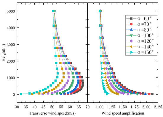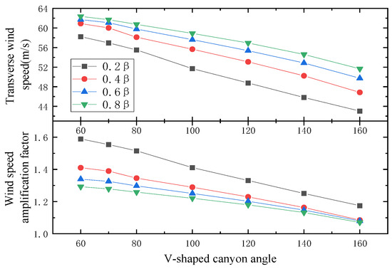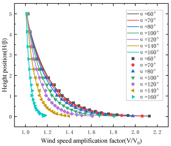 For the V-shaped canyon, it can be seen from Figure 13 that the wind speed in the same section decreases almost linearly as the canyon angle increases. When the height increases, the relationship between the wind speed and the canyon angle becomes less pronounced or less significant.