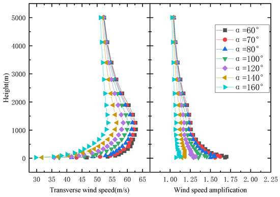 The wind profiles and wind speed amplification factor at different locations of the V-shaped canyon’s central section are shown in Figure 9 and Figure 10. The results reveal that V-shaped canyons with differing angles exert a significant influence on wind speeds, and the wind speed increases with canyon angle resulting in higher maximum wind speeds as higher altitudes. Wind speeds decrease gradually to the gradient wind speed beyond an altitude of 1000 m. The flow field exhibits greater turbulence for smaller canyon angles, signifying an inverse relationship between canyon angle and the degree of impact on the flow field. The changing law remains consistent at different locations. With the increase in distance from the mouth of the valley, the envelope range of the wind profile at different canyon angles gradually narrows and eventually stabilizes. When located at 0 L, the wind speed difference between 60° and 160° below 1000 m is approximately 15 m/s, whereas the wind speed difference at 4 L is about 10 m/s. At the same time, it can be found that the canyon angle has an effect on the overall influence height of the wind field. It shows that the smaller the canyon angle, the greater the impact on the wind field. When the angle is reduced to 160°, the influence height of the canyon reduces slightly to approximately 3000 m.
