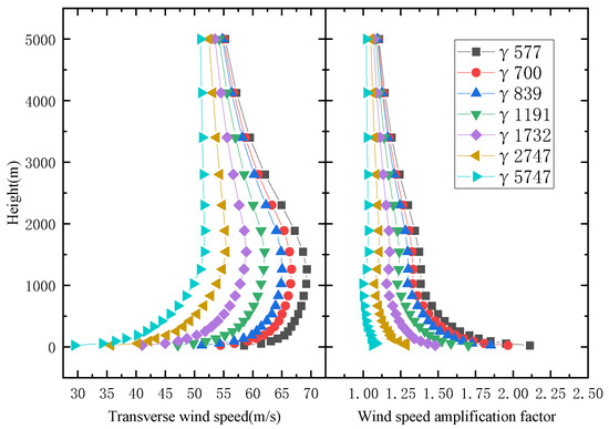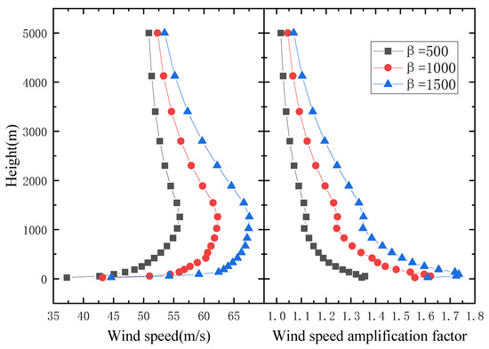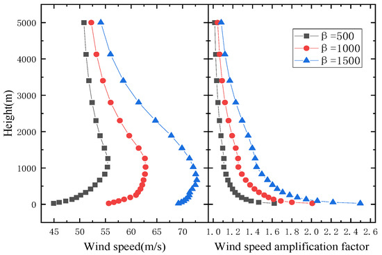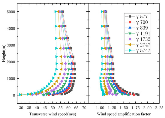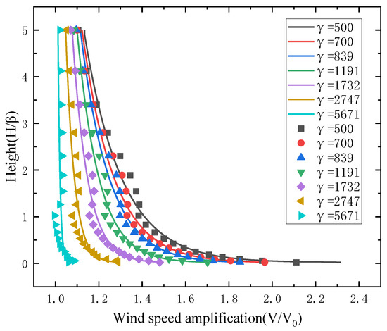For a U-shaped canyon with γ = 5671 m as it is shown in Figure 8, the wind speed increases with the increasing canyon height and finally tends to stabilize. The wind speed amplification factors vary slightly along the height. Neither of them are affected by the deepening of the river.