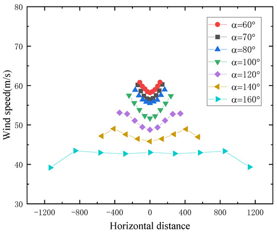 It can be seen from the Figure 16 that when the canyon angle is large enough, for example, α = 160°, the wind speed in the canyon away from the walls on both sides is practically the same as the incoming wind speed, which indicates that the influence of the canyon on the wind field has basically disappeared. Judging from the distribution along the river, the airflow will produce a significant wind speed increase when entering the canyon, which gradually decreases along the river and finally forms a stable wind speed profile. From the perspective of the length of change in wind speed along the river, it can be seen that as the canyon angle increases, the length of change required for the wind speed to reach the same magnitude in the canyon gradually decreases. This shows that when the canyon angle increases, the wind speed acceleration effect at the mouth of canyon gradually disappears.