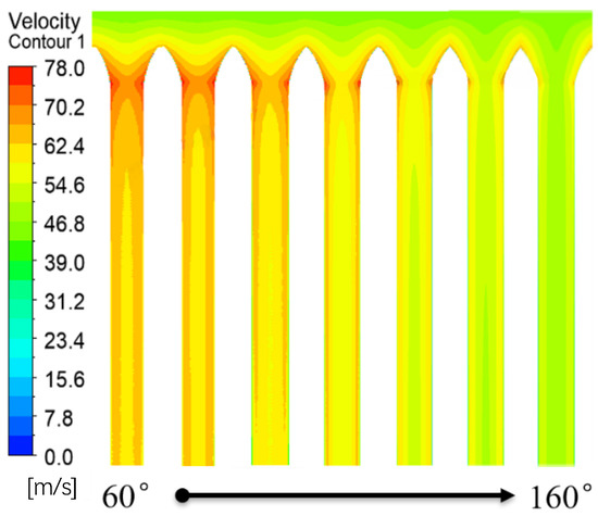 For the V-shaped canyon, as shown in Figure 15, the wind speed at the same height gradually decreases as the canyon angle increases, and the extent of the decrease is positively correlated with the angle. When approaching the center of the canyon, the wind speed changes at different angles are essentially the same, exhibiting higher wind speeds on both sides and lower wind speeds in the middle. When the canyon angle reaches 160°, the wind speed in the middle of the V-shaped canyon remained nearly unchanged.