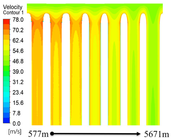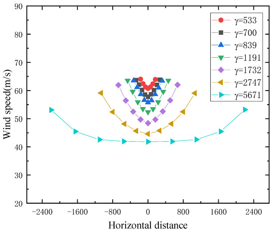 For the U-shaped canyon, as shown in Figure 17 and Figure 18. When the canyon width increases, the wind speed at the same height gradually declines. The wind speed presents a U-shaped distribution. When the canyon width reaches 5671 m, the wind speed in the middle of the canyon exhibits a uniform distribution, indicating that the airflow in the middle of the canyon is minimally influenced by the canyon boundaries. The variation pattern of wind speed is roughly the same as that of the V-shaped canyon. Additionally, the distribution of wind speed contours is similar.