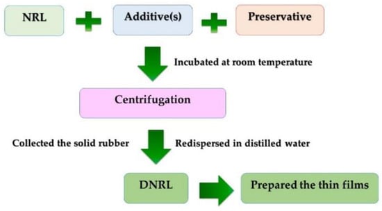 NRL contains over 200 different types of proteins, among which 15 proteins (Hev b1 to Hev b15) have been officially listed as allergenic proteins by the World Health Organization (WHO)/International Union of Immunological Societies (IUIS) Allergen Nomenclature Sub-Committee [18]. These natural proteins in rubber have been associated with asymptomatic sensitization as well as IgE-mediated hypersensitivity. Various methods have been attempted to reduce protein contamination in NRL to produce low hypersensitive NRL materials [8,9,10,12,13,14,19,20,21,22,23]. The centrifugation method is commonly employed at an industrial scale for the commercial production of concentrated NRL. This process can reduce some proteins to obtain DNRL [24,25,26]. However, the efficiency of protein reduction is not yet perfect, and thus, a combination of chemical and physical methods should be developed to minimize the allergenicity risk of NRL proteins. Additionally, the color of the NR matrix is an important quality aspect that needs consideration. Pale-colored NR blocks or thin films are desirable features for high-quality products and can yield higher economic value [27]. Therefore, in this study, the use of additives and preservatives was investigated to reduce these proteins in NRL while maintaining its properties such as stability, extended shelf life, film formation, and film properties. Furthermore, the removal of other constituents apart from the rubber polymer in the latex is crucial as they may affect certain rubber properties, particularly the discoloration of NRL films. Ultimately, this developed process may also yield pale-colored rubber products.