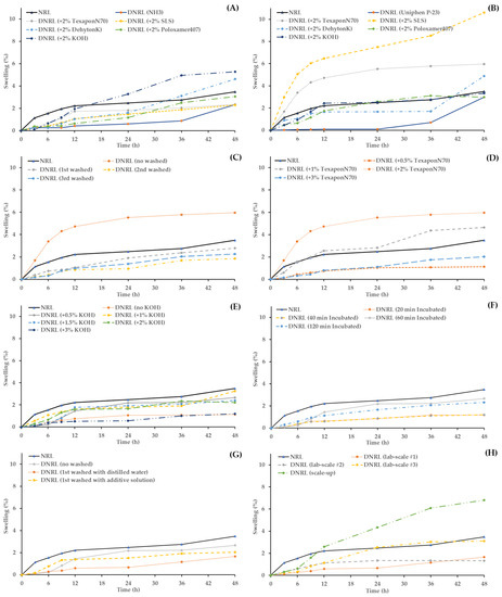 Swelling properties of dried NRL and DNRL films: Effect of (A) additive with 0.2% w/w NH3 as a preservative, (B) additive with 1% w/w Uniphen P-23 as a preservative, (C) washing cycle with 1% w/w Uniphen P-23 and 2% w/w Texapon N70, (D) concentration of Texapon N70 with 1% w/w Uniphen P-23, (E) concentration of KOH with 1% w/w Uniphen P-23 and 0.5% w/w Texapon N70, (F) incubation time with 1% w/w Uniphen P-23, 0.5% w/w Texapon N70, and 0.5% w/w KOH, (G) washing solution with 1% w/w Uniphen P-23, 0.5% w/w Texapon N70, and 0.5% w/w KOH, and (H) reproducibility and scale-up of optimum DNRL formulation.