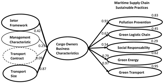 Cargo owners’ business characteristics are especially identified (Figure 2) by the size of shipments and the relationship they have with transport service providers (β = 0.87), by the sector framework with evidence of sector and environmental regulation, green taxes, and the weight of transport costs in the sector (β = 0.42), and also by the management characteristics of the companies, which contribute to the commitment and alignment of sustainable practices with transport, green associative models, and the use of sustainability indicators for higher environmental requirements (β = 0.25). The type of transport contract, which includes long-term contracts and the use of full ships and containers, contributes very little as a business characteristic of cargo owners (β = 0.09).