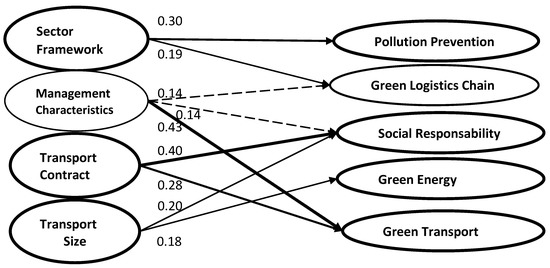 This study shows that management characteristics have a strong relationship with green transport (β = 0.43) and transport contracts have a strong relationship with social responsibility (β = 0.40). Additionally, the regulatory framework has a strong influence on pollution prevention (β = 0.30) and green logistics chains (β = 0.19). There are three groups of relevant effects in the influence relationships. On the one hand, management characteristics and transport contracts have a strong relationship with social responsibility (β = 0.40; β = 0.20), and management and transport contracts have a strong relationship with green transport (β = 0.43; β = 0.28). On the other hand, the sector framework has a strong relationship with pollution and green logistics chains (β = 0.30; β = 0.19). Finally, the transport size is related to social responsibility (β = 0.20) and green energy (β = 0.18), influencing the use of green fuels such as methanol, hydrogen, LNG, HVO, and RME.