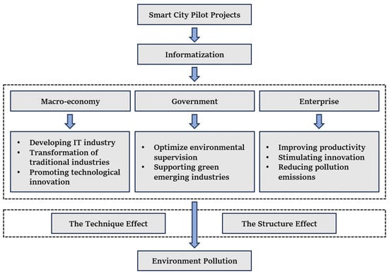 Against the backdrop of China’s pursuit of high-quality economic growth, particularly under the constraint of the “double carbon” targets, the establishment of resource-efficient and eco-friendly smart cities has gained widespread recognition []. Enabled by digitalization and intelligence, such cities offer a viable means to affect a green and low-carbon transformation and reshape urban society. By mitigating urban environmental pollution, smart cities have the potential to create mutually beneficial economic outcomes. Briefly, based on the achievements and shortcomings of previous studies, we employed a timing-varying DID model to assess the environmental impact of informatization by treating SCP projects in China as a quasi-natural experiment for modern urbanization. Our panel data analysis of 214 prefecture-level cities revealed that SCP projects were effective in significantly reducing urban SO2 emissions. That is to say, informatization has significantly reduced EP. In addition, we also found that informatization affects the macro-economy and adjusts the behavior of enterprises and governments, thus improving the environment through the technique effect and the structure effect.