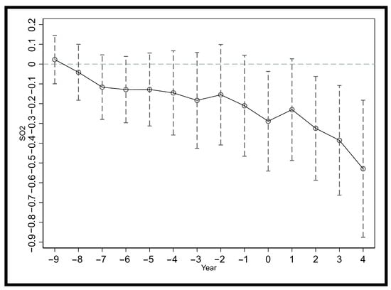 The estimated parameters of Equation (1) using a two-way fixed effect model are shown in Table 2. There is no control variable added with columns 1 and 2, and columns 3 and 4 are added for comparison. Table 2 shows that building smart cities significantly exerts a negative impact on SO2, both total and per capita, regardless of whether control variables are added. On average, the SCP projects lead to declines in SO2 total emission and per capita by approximately 20.7% and 21.1%, respectively. Hence, informatization significantly reduces the EP of cities. This result is very different from the conclusions of [].