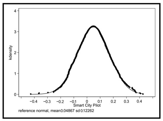 Thus, in order to mitigate potential estimation biases resulting from unobservable factors that could impact the reduction of SO2 emissions in smart cities, we employ a placebo test. Specifically, we first randomly select a corresponding number of samples as the actual pilot cities that year to be the treatment group cities and the others as the control group. Then, we re-estimate Equation (1) according to the new sample and repeat this random progress 1000 times to the mean of coefficients α1 [,]. If the result above of Equation (1) is robust, then the mean of these 1000 coefficients will be equal to or close to 0 and not systematically different from 0.