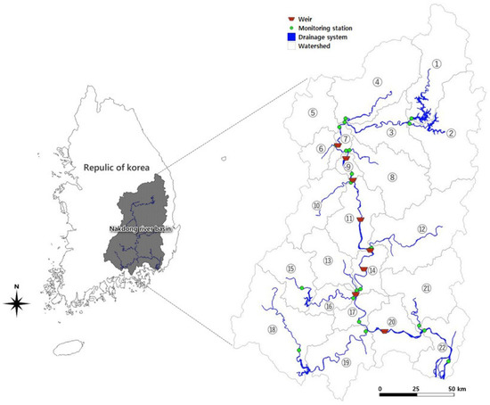 The Nakdong River system consists of a total of 22 watersheds and eight multifunctional weirs, which are major hydraulic structures in the mainstream (Figure 1). The numbering of watersheds indicated in the Figure 1 has been accurately labeled with the corresponding watershed names in Table 1. To manage water quality effectively, target water quality (TWQ) standards are established within the framework of the national water management master plan, which is formulated by the government. These TWQ standards serve as a guideline for pollution source management activities implemented within the watershed. The Nakdong River Watershed Water Environment Management Plan is an overall plan that is the basis for subwatershed-specific water environment management plans in the Nakdong River watershed. The plan expands and develops water quality and water ecosystem conservation measures. It analyzes water quality standard achievements through sample analysis of representative points in the watershed, and it also conducts overall water environment management. Further, the watershed has undergone environmental water changes owing to the installation of multifunctional weirs due to the Major Rivers Project in 2012. This makes it an important watershed to evaluate the water quality management due to environmental changes [20]. The Major Rivers Project in 2012, also known as the Four Major Rivers Restoration Project, refers to a large-scale initiative undertaken in South Korea for the comprehensive restoration and management of four major rivers: the Han River, Nakdong River, Geum River, and Yeongsan River.