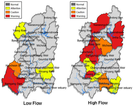The BOD was found to have a high probability of exceeding the target standard under low flow (approximately 60–100%) conditions. Gamcheon, Hoecheon, Hapcheon Dam, and Nakdong River estuary watersheds were found to be particularly vulnerable to BOD water quality control with a probability of exceeding the target standard by more than 1.4 times. Under high flow (approximately 10–60%) conditions, Nakdong Sangju, Gumi Weir, and Nakdong Milyang middle watersheds were found to be vulnerable to BOD with a probability of exceeding the target standard by 1.2 times or more.