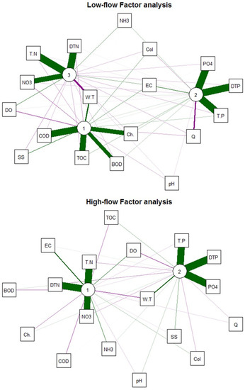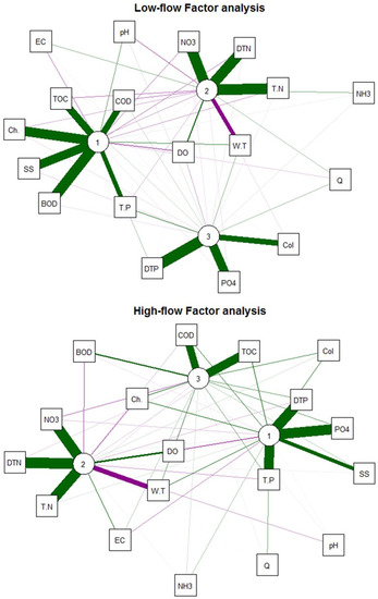 In the Namgang Dam watershed, we found that the variation of water quality characteristics during low and high flows are only marginally different. At low flows, phosphorous-based water quality items and total coliform counts are grouped in the same factor. This contrasts with the influx of livestock manure, a nonpoint source of pollution that is generally [34] attributed to rainfall runoff. It is believed that runoff from these nonpoint sources also occurs at low flows.