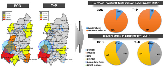 Namgang Dam watershed also has a very high proportion of livestock farming in the pollutant load (BOD: 44%, T-P: 48%). The FA results showed that phosphorus and total coliform bacteria belong to the same factor. This suggests that runoff from livestock pollution sources occurs at low flows. In addition, with nine public watershed treatment plants (16,600 tons/day in total) and 145 small-scale public watershed treatment plants (11,562 tons/day in total), it should be necessary to control the discharge amount of treatment facilities during low flow periods in addition to managing livestock pollution sources.