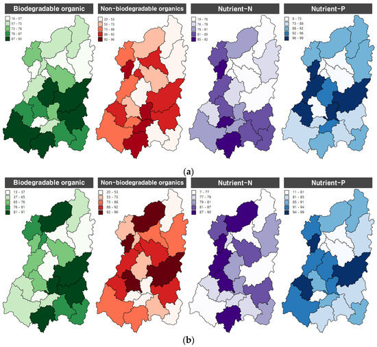 Quantitative pollution source classification was performed using the factor matrix values of the watershed, and the FA results displayed various pollution source characteristics in the analyzed results. Two water quality variables, BOD and Chl-a, were used to classify water pollution sources according to biodegradable organic matter. Nutrients were classified into N-based and P-based items to characterize water pollution sources. The chemical oxygen demand (COD) and total organic carbon (TOC) were used to characterize the water pollution sources based on poorly degradable organic matter. The classification criteria are similar to the eigenvector of the principal component analysis (PCA). The average value of each water quality variable was calculated using the factor loading value, which indicates the influence of each common factor on the measured variable. Subsequently, the pollution source status of each watershed was evaluated for relative flow condition vulnerabilities. Figure 9 displays the average water quality factor loading value of the variables of 22 watersheds classified by pollution source, divided by quantile, and compared by heat mapping. It was possible to distinguish between watersheds with various pollution source characteristics and watersheds which required specific pollution source management. Through this result, it was possible to make a primary decision on which water pollution source to manage according to flow conditions.