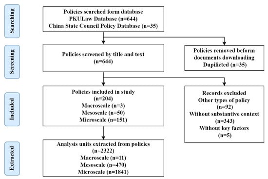The China State Council Policy Database (www.gov.cn, accessed on 3 January 2023) is the most authoritative policy database of the Chinese central government and collects central-level policy documents issued by the State Council and its constituent departments. The Peking University Law Information Database (PKULaw) is a non-official policy database that provides a platform which can be publicly searched for policy and enables users to download the full texts of over 1.2 million policy documents at all levels of the Chinese government [32]. (Figure 1) We searched for policy documents containing both “healthcare reform” and “drug” or related terms such as “consistency evaluation”, “dual invoicing”, and “zero-markup” between 2009 to 2022 in both databases. We then retrieved and downloaded 644 policy documents related to China’s drug reform. In order to ensure the accuracy of the data, retrieved policy documents were reviewed, and documents that could not effectively reflect the policy makers’ intention in drug reform under the healthcare reform system were excluded. The following criteria were applied: (1) the title of policies containing “opinion”, “scheme”, “plan”, “measure”, “method”, and “notice” were included in the analysis, while articles entitled “report”, “correspondence” and other types of policies were excluded; (2) policy documents that only mentioned drug reform, which did not contain substantive content, were excluded through joint discussions with the first, third, and corresponding authors; and (3) policy documents that contained only several words describing drug reform and from which we were unable to extract key factors were excluded. Ultimately, 204 policy documents were included in this analysis, including national healthcare policies, healthcare reform policies, and drug reform policies representing macro-, meso-, and microscale policies on drug reform, respectively, reflecting governance intentions at all levels.