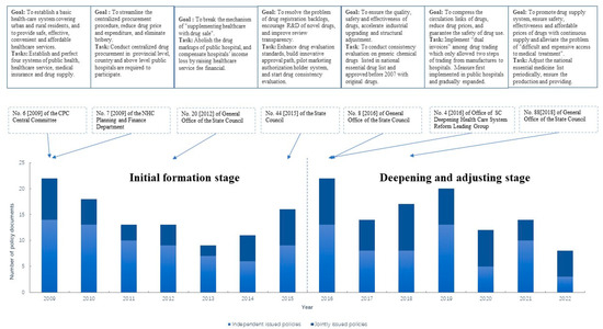 Between 2009 and 2022, China’s drug reform experienced two stages, namely, the initial formation stage, in which policy makers implemented bold reform measures to reconstruct drug supply chains, and the deepening and adjusting stage, in which the reform focused on internal factor coordination and comprehensive healthcare development. The factors in policies have become more closely intertwined, with instruments and implementers growing ever more diverse [36].