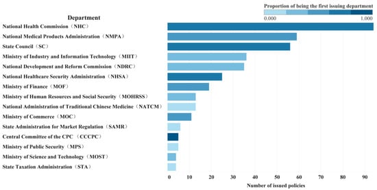 As is shown in Figure 3, the National Health Commission (NHC) is the primary government department leading drug reform, issuing nearly half of the reform policies either independently or jointly. This indicates that China’s drug reform is more than a reform of the drug sector, but instead constitutes a supportive and coordinative system under a reform of China’s healthcare system for the purpose of establishing and perfecting basic healthcare systems that provide universal healthcare service to all Chinese residents. Subsequently, the National Medical Products Administration (NMPA), along with the State Council (SC) and its affiliated offices, is also responsible for the formulation and issuance of reform policies, with the former focusing on micro-level policies related to drug regulation, and the latter issuing macro-level policies that are directional and embody national top-down design. In 2018, several departments related to drug governance were reorganized, including the cancellation of the State Council Office of the Leading Group for Deepening Medical and Healthcare System Reform, with the functions taken over by the NHC, and the establishment of the National Healthcare Security Administration (NHSA), which integrates functions of medical insurance, healthcare service pricing, and drug procurement. Since its establishment, the NHSA has issued 25 drug reform policies that highly affect the drug sector and has become one of the most influential departments in the area of drug reform. The four government departments mentioned above not only issued a large number of policies but were also dominant in more than 60% of policies they issued jointly, demonstrating their key function in leading drug reform. In addition, several other government departments, including the Ministry of Industry and Information Technology (MIIT), the National Development and Reform Commission (NDRC), and the Ministry of Finance (MOF), also issued policies to direct different aspects of drug reform, such as industrial development, pricing, and financial support.