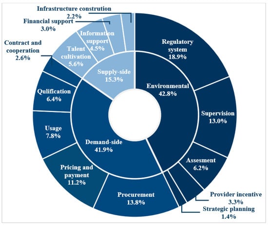 From Figure 4, it can be seen that the most commonly used policy instruments in drug reform policies are environmental instruments and demand-side instruments, accounting for 42.8% and 41.9% of the total polices implemented, respectively. Supply-side instruments are less used in drug reform policies, accounting for only 15.3% of the total instruments used.