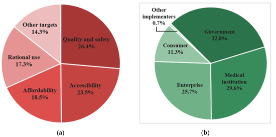 Percentage of factors in China’s drug reform policies, 2009–2022: (a) policy targets; (b) instrument implementers.