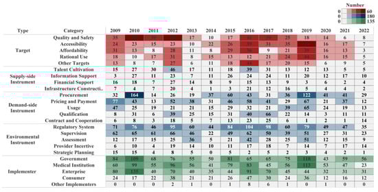Implementers are the subjects involved in the implementation of policy instruments, completing the approach to drug reform with the core piece. Figure 5 shows that government departments play the most important role in instrument implementation. This situation prevails primarily due to the environmental instruments used most frequently in drug reform policies as they need to be carried out or participated in by government departments. Medical institutions comprising public hospitals, primary healthcare institutions, community health centers, and other healthcare facilities are also key implementers of policy instruments. Moreover, enterprises including manufacturers, trading enterprises, distribution enterprises, retailers, and other enterprises along the supply chain are the root suppliers of drugs, meaning that their functions in utilizing reform policy instruments are irreplaceable. Several other implementers are involved, such as media, social organizations, research institutions, etc.