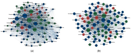 Based on the co-word analysis theory, when more than one of the key policy factors identified appears in the same analysis units, they have essential relationships [35]. Additionally, the more frequently two factors co-occur, the closer their relationship is. To this end, co-word analysis of targets, instruments, and implementers is conducted on both the initial formation stage and the deepening and adjusting stage to discover the relationship between key factors and illustrate reform approaches to achieve sustainable drug supply. In Figure 7, nodes represent key factors identified from drug reform policies, and red, blue, and green nodes denote targets, instruments, and implementers, respectively. A linkage between two nodes exists when both accord in the same analysis unit, which indicates correlation. For example, an instrument is linked with its targets, its implementers, and other instruments used together. Furthermore, values of social network analysis are counted in order to identify key roles in different stages. In the network, cluster graph density and average path length are two significant indexes that assess the interconnectedness of nodes within the entire cluster. Graph density quantifies the actual number of links in relation to the maximum possible links, while the average path length represents the average number of steps along the shortest paths for all connected nodes. Moreover, centralities provide measures for evaluating the importance of individual nodes. Degree centrality evaluates importance based on the number of links each node possesses, while betweenness centrality calculates the frequency with which a node lies on the shortest path between other nodes. For this study, a policy factor with a high degree of centrality is directly linked with many other factors, while a factor with high betweenness centrality is the shortcut junction of many independent factors.