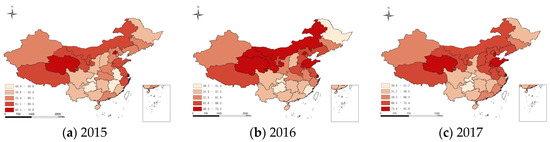 In the SLM, per capita GDP was positively correlated with O3 concentration (0.00007). Per-capita GDP reflects the socioeconomic growth of a region and indicates socioeconomic development, regional planning, and environmental protection, and thus, it can affect changes in O3 [58]. Over the past six years, China’s per capita GDP increased from 49,500 yuan in 2015 to 70,700 yuan in 2020, growing at an average annual rate of 35.3% over the preceding six years. The growth rate was relatively high, and energy consumption was high, with coal serving as the main energy source in recent decades, leading to high O3 emissions [67]. However, some studies have found an inverted U-shaped distribution between China’s GDP and O3 concentration, mainly due to wide regional disparities. Additionally, the effect of GDP on O3 varied greatly among regions at different developmental stages [68]. The correlation between economic development and ecological health in economically developed areas crossed the EKC inflection point, and per capita GDP was negatively related to O3 concentration, while in economically underdeveloped areas, the mode of economic development has changed from extensive to centralized, promoting environmental improvement [23]. For example, in Ningxia, O3 increased from 62.8 µg/m3 in 2015 to 65.5 µg/m3 in 2020, with an increase rate of 4.3%, and per capita GDP increased from 378.76 million yuan in 2015 to 550.21 million yuan in 2020, with an increase rate of 45.3%.