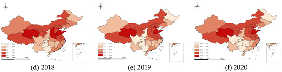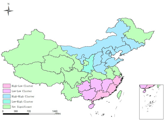 To investigate whether there was spatial autocorrelation of O3 concentration among provinces in China, a spatial autocorrelation analysis was performed on O3 concentration in 31 provinces in China from 2015 to 2020. As displayed in Figure 7, the mean annual Moran’s I for O3 concentration passed the 95% significance test and was positive, suggesting that the spatial distribution of O3 concentration in all Chinese provinces had a significant spatial correlation. The Lisa index was utilized to identify five spatial autocorrelation clustering relationship types (Figure 8): (1) “high–high” clustering (HH); (2) low–low clustering (LL); (3) high–low clustering (HL); (4) “low–high” clustering (LH); and (5) no significant agglomeration characteristics. According to the results, the national O3 concentration displayed “high–high” clustering, “low–low” clustering, “low–high” clustering, and “high–low” clustering characteristics. The “high–high” clustering types were primarily located in the Beijing–Tianjin–Hebei region, Inner Mongolia, Jilin, Liaoning, Shanxi, Shandong, Henan, and Ningxia. The O3 concentration change rate in these regions was relatively high, and they were in the diffusion effect region of O3 concentration growth, leading to an increase in the number of cities with high O3 concentrations that were adjacent to highly polluted areas [55]. In contrast, the clustering area of the change rate of low O3 concentration was primarily distributed in Guizhou, Hunan, Jiangxi, Guangxi, Hainan, and other regions. The urban air diffusion conditions in these regions were favorable and beneficial for the diffusion of pollutants [56], causing a low-low concentration. These cities were surrounded by cities with low O3 concentrations, causing the oxygen concentration to decrease. The high–low cluster type was distributed in Zhejiang, Fujian, and Guangdong. These cities were surrounded by cities with low O3 concentrations and showed spatial agglomeration and cross-regional migration [57]. As a result, the concentration of O3 in cities with high O3 concentration continued to rise, while that of cities with low O3 concentration continued to decline. Shaanxi Province had a low-high clustering distribution, and the high concentration of O3 in neighboring provinces adversely affected Shaanxi.