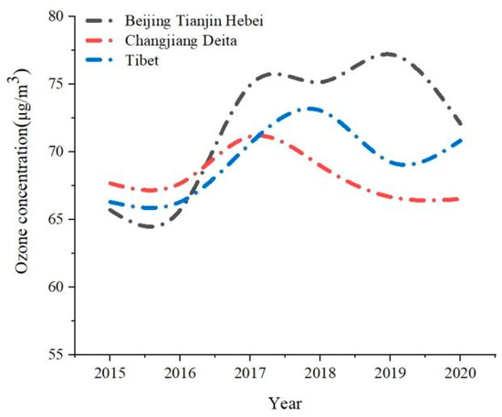 The average annual O3 concentration in the Beijing–Tianjin–Hebei region, Yangtze River Delta, and Tibet from 2015 to 2020.