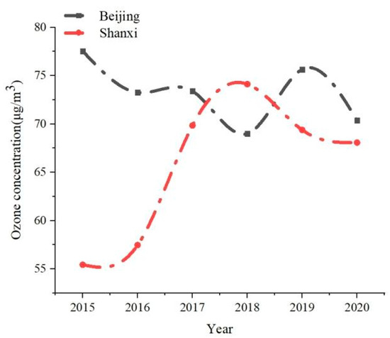 The average annual O3 concentration in Beijing and Shanxi from 2015 to 2020.