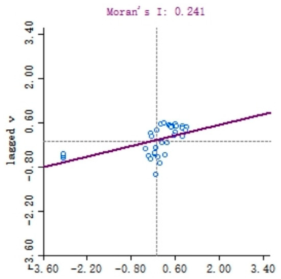 Here, I indicates the global Mohn index, indicates the total number of cities; and indicate the observed O3 pollution values of the and cities, respectively; refers to the average O3 concentration values of cities; indicates the spatial weight matrix element, whose values are 1 or 0, indicating adjacent or non-adjacent cities, respectively. Moran’s I has a value that fluctuates between −1 and 1. With the value being closer to −1, the spatial units with different attributes are more concentrated. Conversely, when the value is closer to 1, the spatial units with similar attributes are more concentrated.