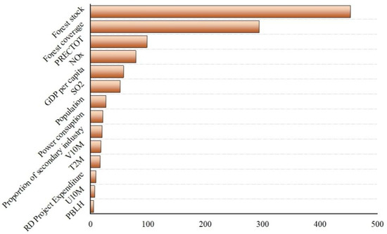 To investigate the spatial autocorrelation of O3, we performed a correlation analysis of 14 meteorological, natural, and socioeconomic factors in each province in China from 2015 to 2020. Considering the spatial correlation, Ordinary Least Squared Regression (OLS) was adopted for estimating the constraint model, and the results indicated that LM-Error (0.034) was statistically more significant than LM-Lag (0.107), leading to the choice of the spatial error model for analysis. In the estimation of OLS, R2 = 0.985, and in the estimation of the spatial error model, R2 = 0.990, showing that accounting for spatial correlation enhances model fit. The findings of the SEM model analysis are presented in Table 1, where a total of 9 variables, including temperature, wind speed, wind direction, per capita GDP, RD project funds, forest stock, forest coverage, SO2, and power consumption, were discovered to make a significant impact on the national O3 concentration. However, the SEM model only presented the linear correlation between variables, whereas some variables might show a nonlinear relationship with O3 concentration. Therefore, a nonlinear model, random forest, was used to improve the accuracy of the simulation of the influencing factors. The random forest result (Figure 9) showed that R2 was 0.503, and along with the above variables, the coefficients of precipitation (98.17) and NOx (78.96) were large, indicating that these factors were significantly correlated with O3 concentration. A multicollinearity test conducted using SPSS26.0 (Table 1) showed that the variance inflation factor (VIF) of wind speed (13.989), NOx (21.233), and power consumption (13.692) was greater than 10, indicating significant collinearity among these three factors.