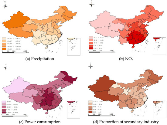Although the SEM model demonstrated that multiple variables influenced O3 concentration across China, it only revealed the global correlation between these variables and O3 without considering regional implications. Consequently, we utilized the GWR model to further investigate the correlation between O3 concentration and regional meteorological, natural, and socioeconomic factors. We examined the correlation of 14 variables, eliminating those with significantly high Pearson’s correlation. Using the GWR model, we measured R2 values greater than 0.5 and identified 10 unrelated variables, including precipitation, wind speed, wind direction, NOx, population, per capita GDP, forest stock, RD project funds, electricity consumption, and the proportion of secondary industry (Table 2). In this study, we used the variables precipitation, NOx, electricity consumption, and the proportion of secondary industry for analysis.