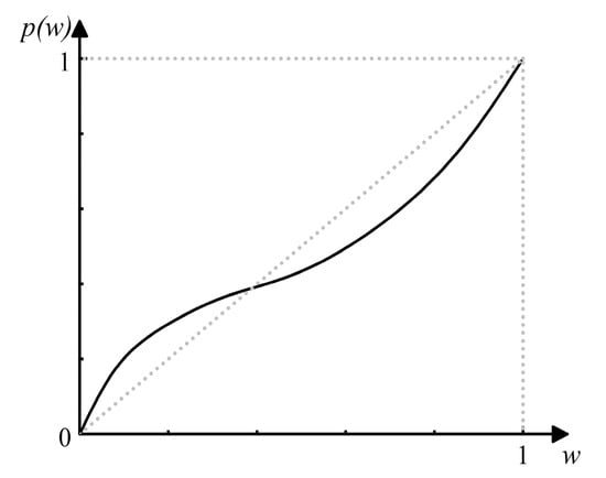 When calculating the cumulative weights, the non-linear function p needs to be linked with the occurrence probability w, as shown in Equation (14). The non-linear function p is called the weight function, and its curve is S-shaped, with a specific image as shown in Figure 3. Under low probability conditions, it is concave upward, and under medium and high probability conditions, it is convex downward. This indicates that in the process of probability change from 0 to 1, people’s subjective evaluation of probability will be distorted. When the true weight value is close to 1, people’s estimated probability of the evaluated object will be close to the actual probability; when the true weight value is far from 1, people tend to overestimate low-probability events and underestimate high-probability events.