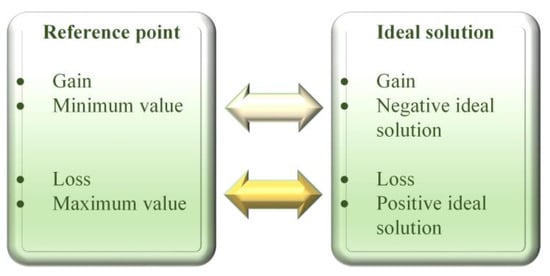 As the value function of cumulative prospect theory depends on the reference point, in this paper, the minimum value is taken as the reference point to calculate the gain and the maximum value is taken as the reference point to calculate the loss. At the same time, TOPSIS also needs to determine the positive and negative ideal solutions and calculate the distance between the target alternatives and their ideal solutions. The reference point of prospect theory coincides with the ideal solution in TOPSIS, as shown in Figure 4. Therefore, we can correspond the reference point with the ideal solution.