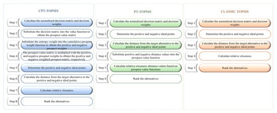 We first compare the calculation process of these three models in Figure 5. The prospect TOPSIS method is based on Liu [58], which combines classic TOPSIS with prospect value function and regret theory. After calculating the distance between the target alternative and the ideal solution in classic TOPSIS, he uses the distance between the target alternative and the positive ideal solution in the loss situation value function and the distance between the target alternative and the negative ideal solution in the gain situation value function. Then, the two new prospect value distances obtained are brought into the proximity equation to calculate the proximity degrees. Because this model only considers the value function and does not consider the weight function, we call this calculation process PT-TOPSIS. Our constructed weighted prospect TOPSIS is abbreviated as CPT-TOPSIS. Moreover, the classic model in this paper is the entropy weight TOPSIS model [59,60] without considering prospect theory.