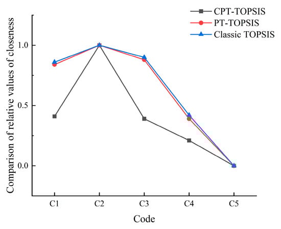 As shown in Figure 6, in CPT-TOPSIS, the result of proximity values is significantly biased after the weight function under level dependence transforms objective weights into subjective weights. The relative value of C2 did not change in all three methods, because the relative closeness (RC) of C2 becomes 1 after standardization and rank first. Additionally, the relative closeness of C1, C3 and C4 is closer to the minimum value C5 compared to classic TOPSIS and PT-TOPSIS, among which C5 is assigned a value of 0 as the minimum. Overall, the proximity values in CPT-TOPSIS are closer to the tail end. This means that when considering more subjective uncertainty, the changes in weights under the influence of the risk attitude coefficient reduced the difference in indicator scores. The similarity between the evaluation results of CPT-TOPSIS and classic TOPSIS indicates that our model is robust. The calculation results of CPT-TOPSIS are more in line with human cognitive psychology than PT-TOPSIS and classic TOPSIS and can reflect the decision-making results influenced by subjective non-rational factors.