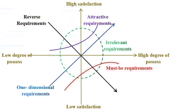 The theory of attractive quality and the Kano model [] was proposed by Professor Noriaki Kano of the Tokyo Institute of Technology, and his team was inspired by the two-factor theory. Based on the analysis of the demands of the service audience, a nonlinear relationship between service quality and the satisfaction of participants was observed, i.e., “not every service supply (lack) could increase (decrease) the satisfaction of the consumer, and the effect of satisfaction with each service content element (increase or decrease) also differs”. See Figure 1.