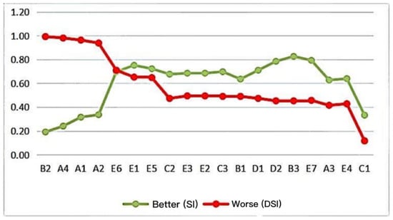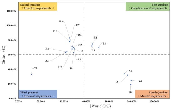 Analyzing the dependence and expectation of the service project, which reflects the effect of each service project on the satisfaction of the service object and the degree of dependence and expectation of the service object on each service intuitively and quantitatively, can avoid the lack of any detailed distinction of the importance of services under the single demand hierarchy. Combined with the above analysis and Table 3 results, the calculation results of the better–worse coefficients in this survey are shown in Table 6 and Figure 2.