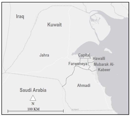 The study’s sample size comprised 438 responses, encompassing participants from all six districts of Kuwait, including Ahmadi, Capital, Farwaniya, Hawalli, Jahra, and Mubarak Alkabeer. A visual representation of these districts is shown in Figure 1, depicting the map of Kuwait. The respondents came from diverse sectors, including government, private, and non-profit organizations, possessing diverse backgrounds and work experiences, ranging from entry-level positions to executive management roles. This diverse sample adds to the robustness and representativeness of the study results. However, given that the survey was conducted using social media platforms, it was not possible to ascertain the exact number of individuals reached by the survey link and, therefore, difficult to estimate the response rate. Nonetheless, the obtained sample is considered suitable for this research.