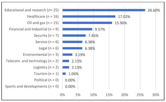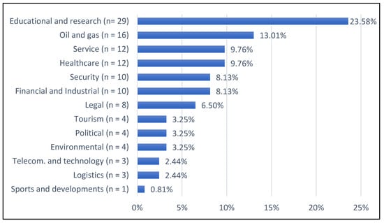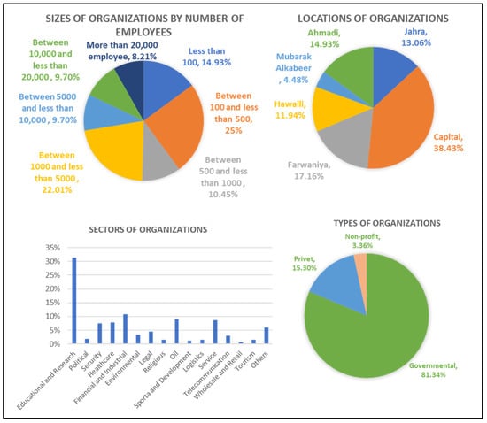 Figure 2 illustrates the demographics and characteristics of the various organizations. According to Figure 2, 81.34% of the organizations were Government-type organizations, with the majority (38.43%) located in Kuwait’s Capital district. The size of the organizations, as measured by the number of employees, ranged from the smallest, with less than 100 employees (14.93%), to the largest, with more than 20,000 employees (8.21%). However, most respondents (22.01%) came from organizations that have between 1000 and less than 5000 employees. Despite working in various sectors and industries, 31.34% of the survey respondents worked in educational and research institutions, the largest single category in the study across the sectors of organizations.
