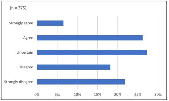 Figure 4 presents employees’ overall perceptions of their organizations’ disaster management competence, including the effectiveness of operations management and supply chain systems in promoting resilience, ensuring efficient resource distribution, encouraging collaboration, and developing solid contingency plans to keep operations running during and after a disaster. The majority of respondents either disagreed or felt uncertain about their organization’s competency in managing disasters, with 21.82% strongly disagreeing and 18.18% disagreeing. In addition, 27.27% of respondents reported feeling uncertain about their organizations’ disaster management competence. On the other hand, 26.18% of respondents reported agreeing with their organizations’ disaster management competence, while only 6.55% strongly agreed. A significant proportion of employees expressed doubts or uncertainty regarding their organizations’ disaster management strategies and capabilities, including operations and supply chain aspects. These findings underscore the critical need for a comprehensive evaluation and the refinement of operational and supply chain strategies and practices within Kuwaiti organizations, with the ultimate goal of enhancing disaster management competencies and fostering greater organizational resilience.
